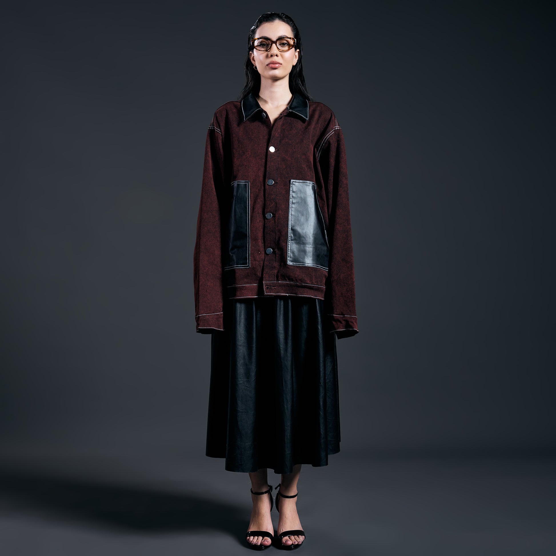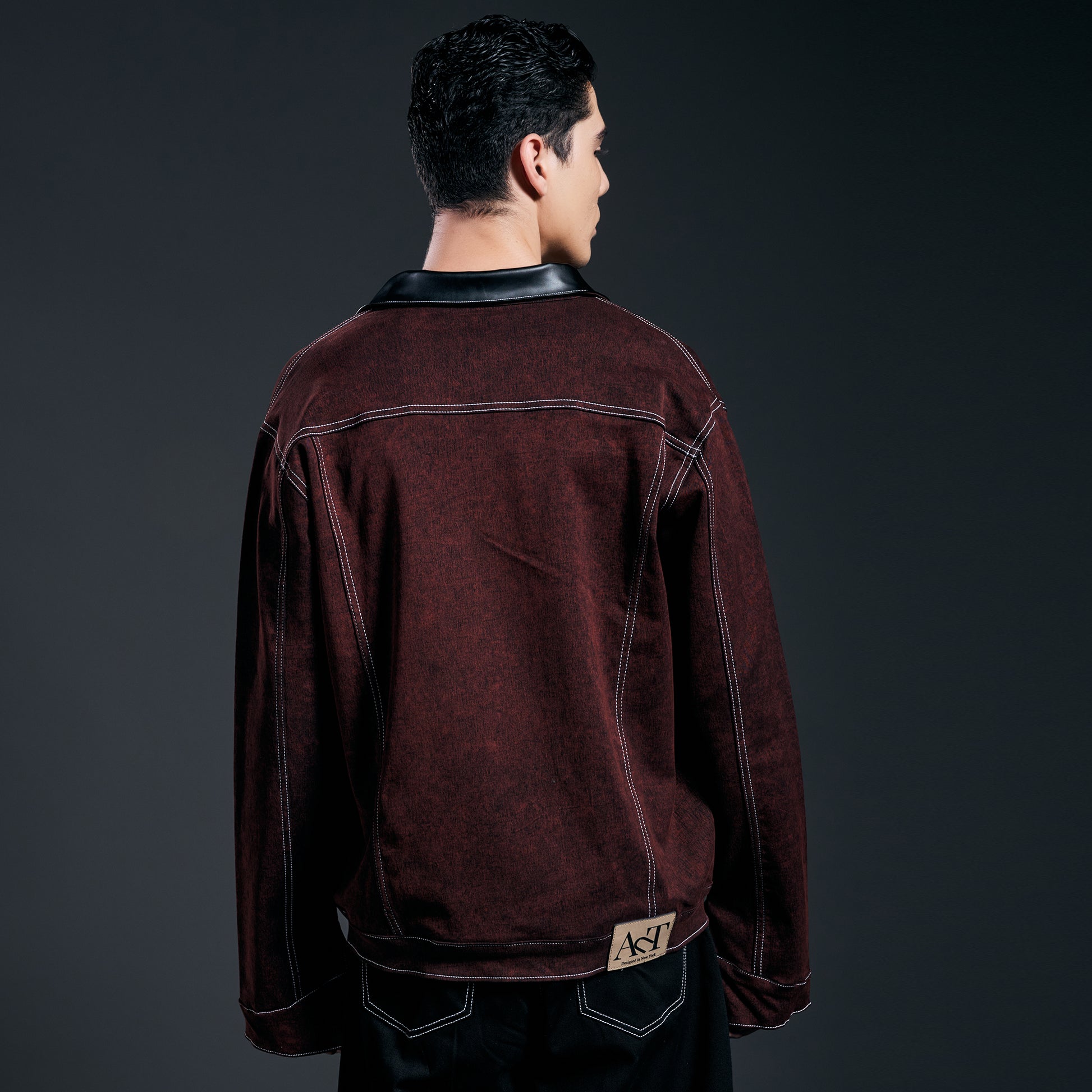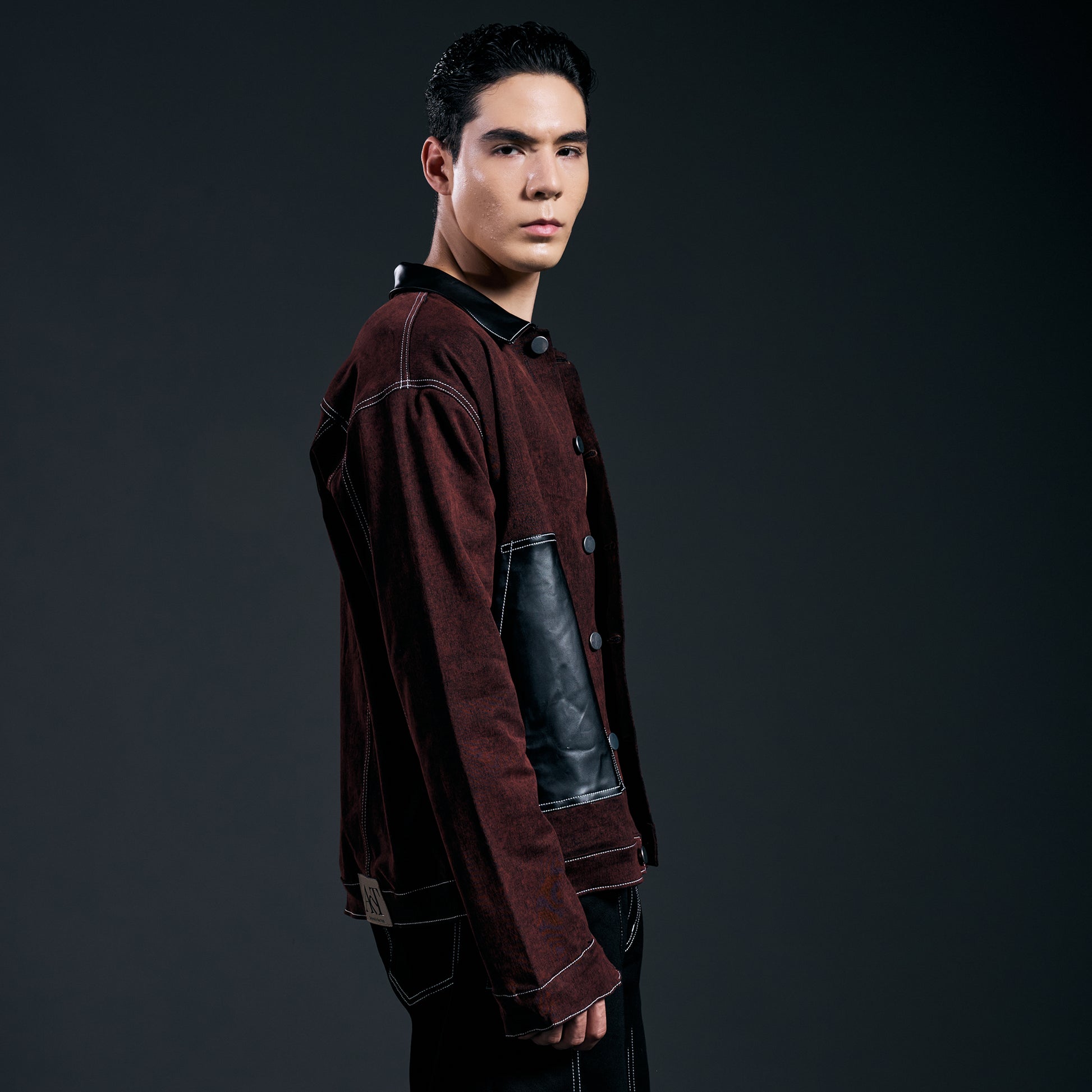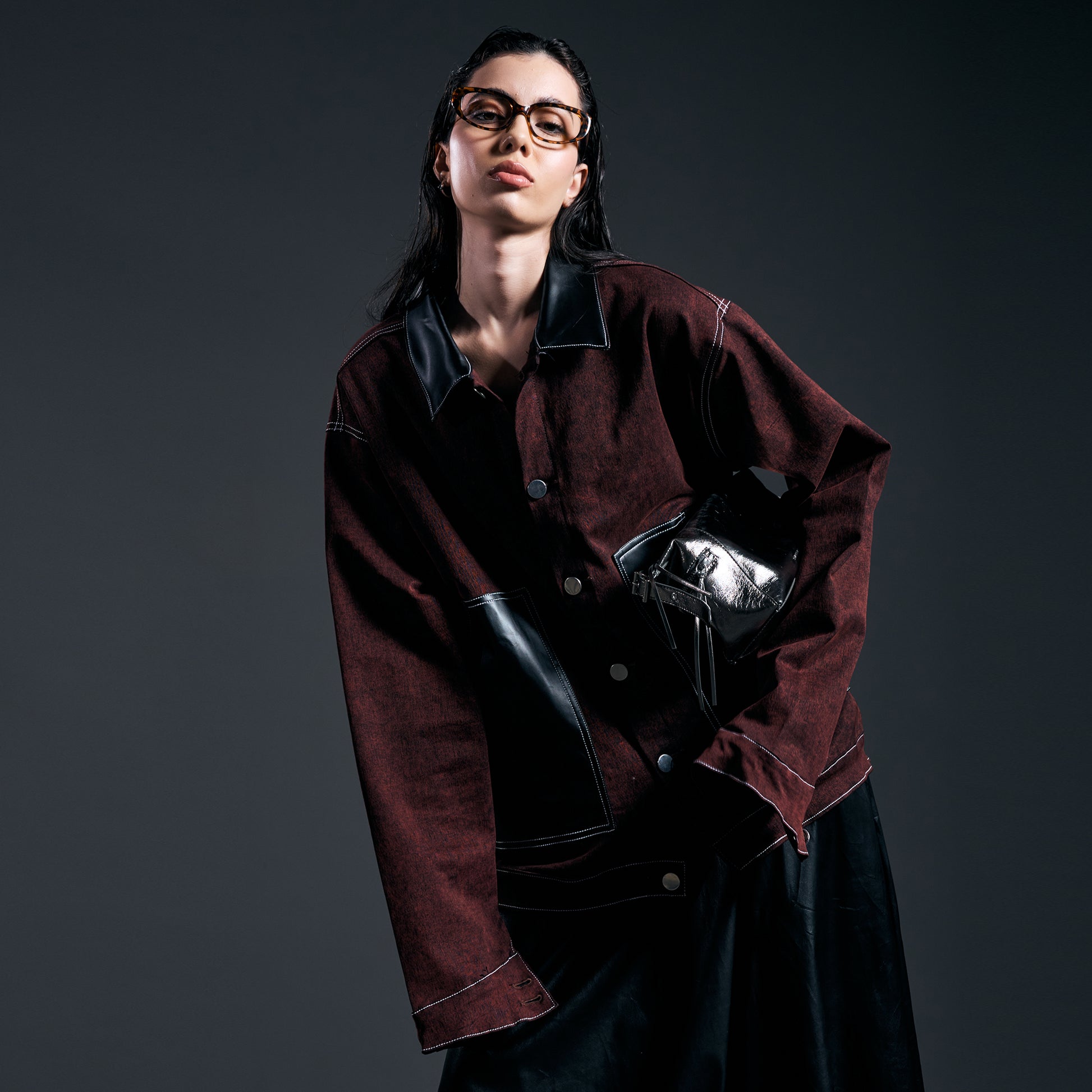 Made from washed brown denim with black leatherette pockets and collar, the Office Hours Jacket blends rugged texture with refined detail — a statement layer bridging professional polish and after-hours ease in the return-to-office uniform.