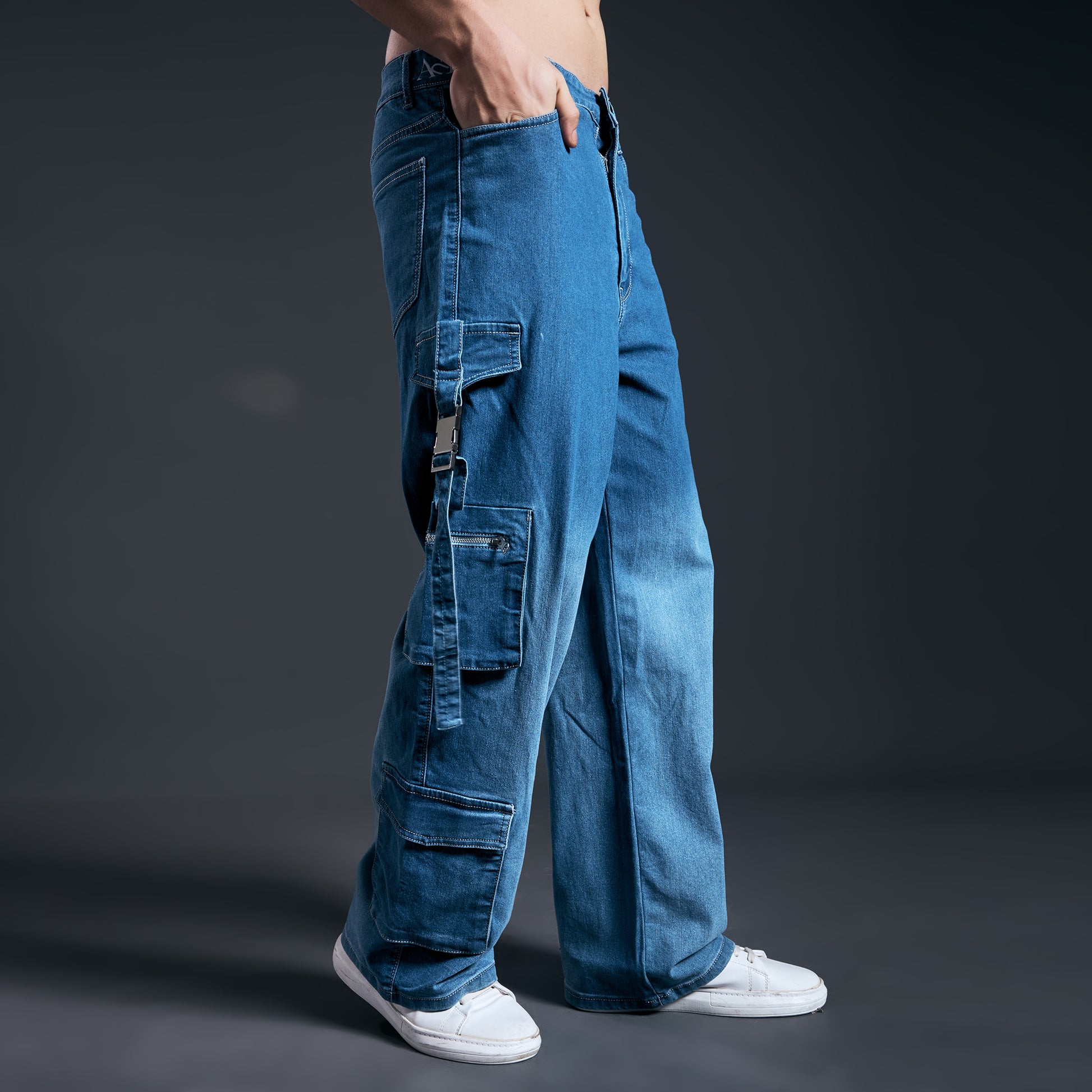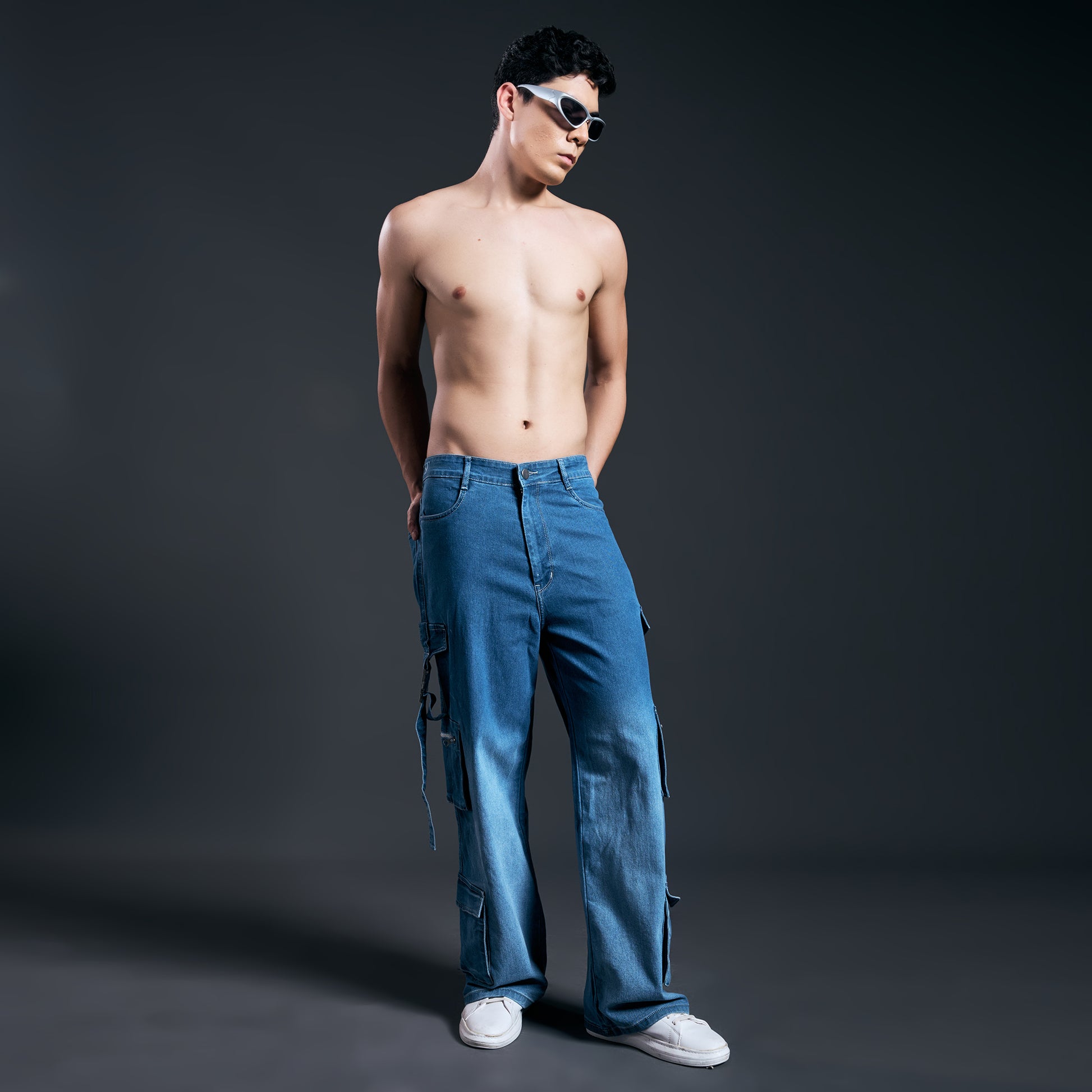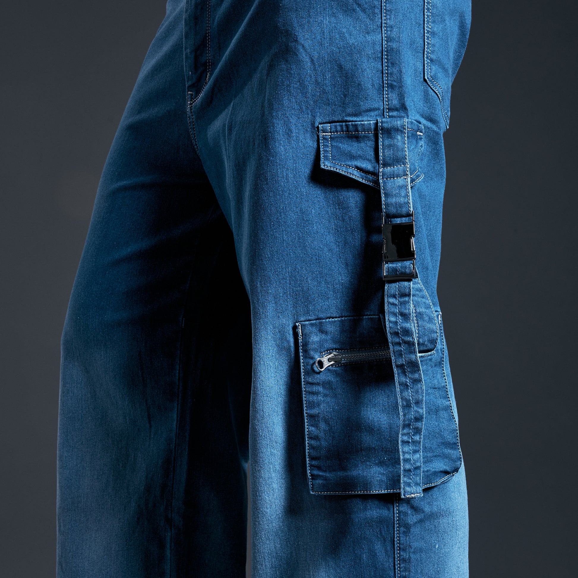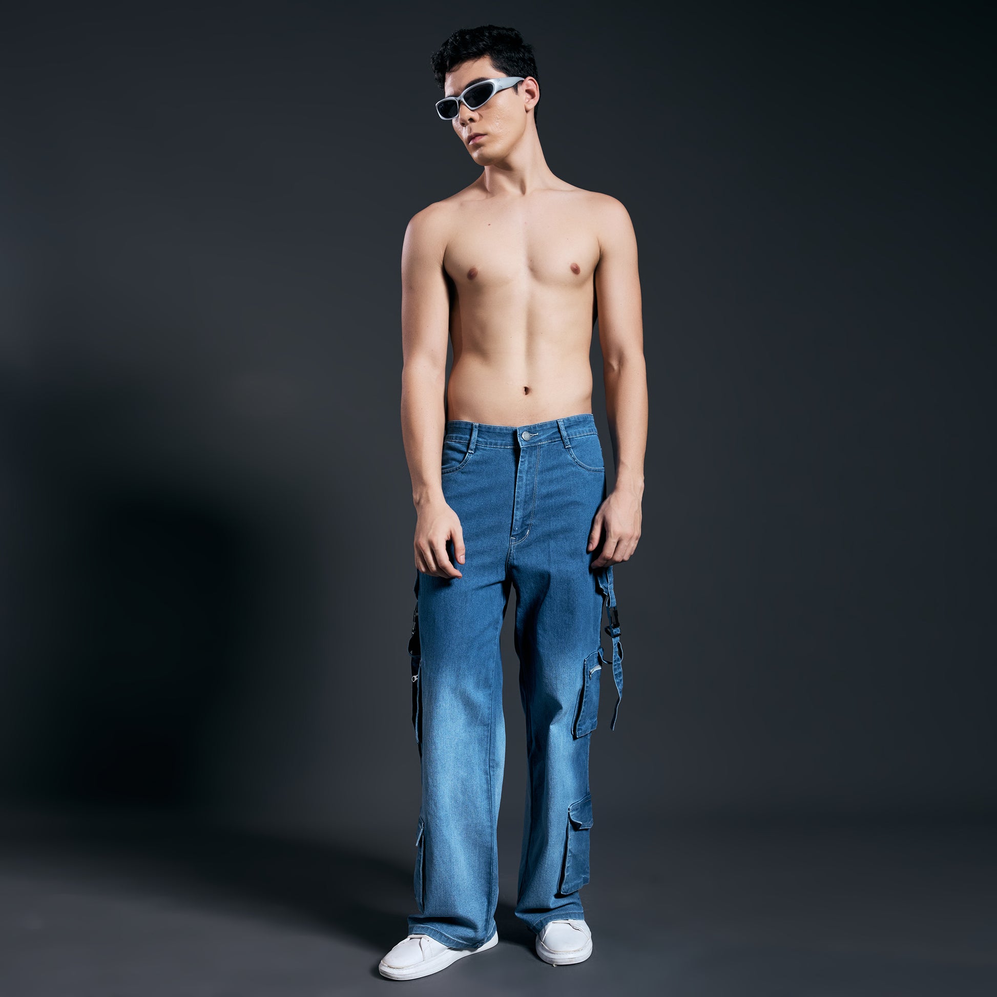 Blue denim with side buckles, mid-thigh and ankle pockets. Built for escape—structured, functional, and ready for anywhere but the desk.