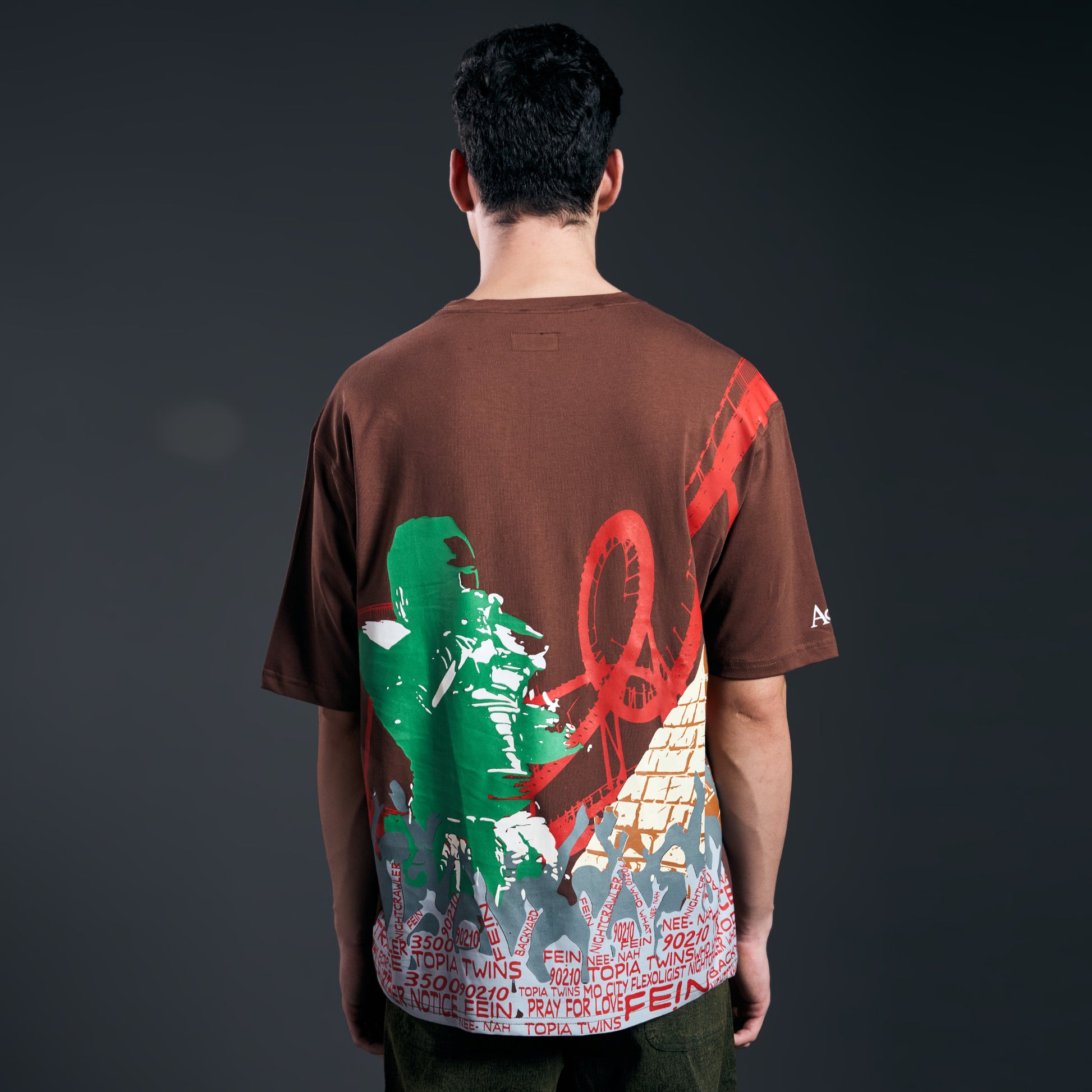 This oversized 220gsm T-shirt features Travis elevated above a crowd, framed by rollercoaster + pyramid motifs. Crowd below inscribed with track titles. A visual dialogue between Astroworld + Utopia. Designed to rage, made for the pit.